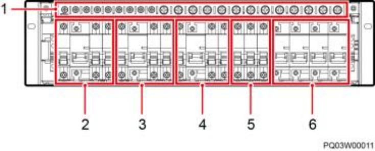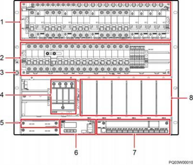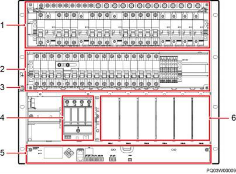 (1)直流配电单元 (2)交流配电单元 (3)接地螺丝 (4)交流防雷器 (5)通信扩展模块安装空间 (6)SMU02B1