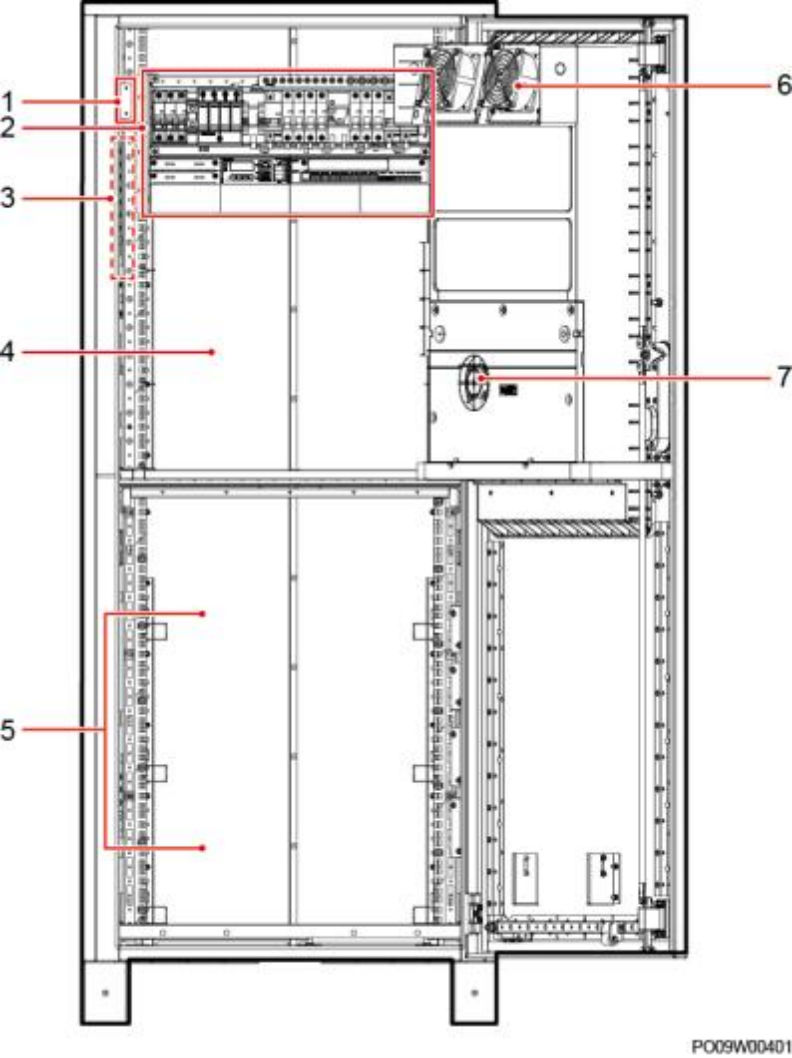 ( 1 )门磁传感器 (2)电源插框 (3)机柜接地排 (4)用户设备安装空间 (5)锂电池安装空间 (6)内循环风扇 ( 7 )外循环风扇 |
