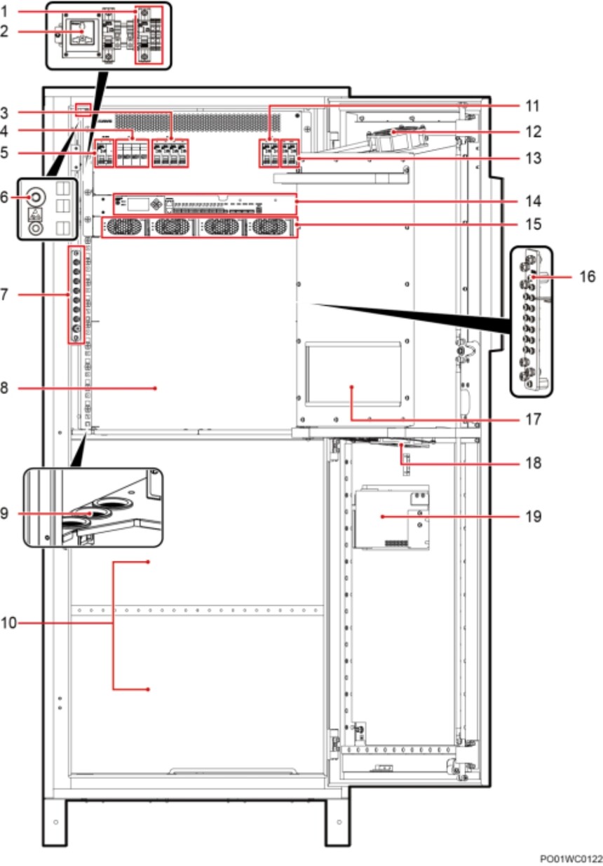 (1)交流输出空开及端子 (2)维护插座 (3)次要负载支路空开