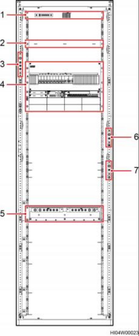 (1)温控供电转接盒 (2)走线面板 (3)设备接地排 (4)DCDU-400AN2 (5)RTN+母排和-48V 铜排 (6)主接地排 (7)设备接地排