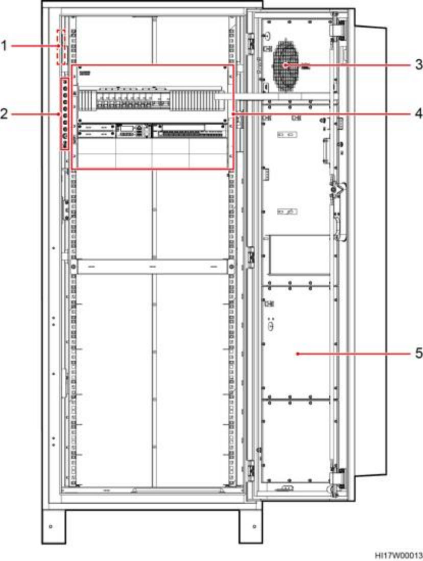(1)温控供电转接盒 (2)接地排 (3)热交换内循环风扇 (4)DCDU-400AN2 (5)热交换外循环风扇
