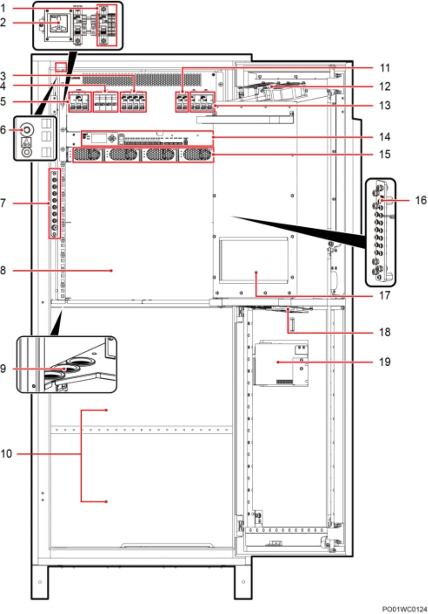 (7)接地排 (8)用户设备安装空间 (9)走线孔 (10)电池安装空间 (11)重要负载支路空开 (12)内循环风扇 (13)电池空开 (14)监控单元 (15)整流模块 (16)RTN+母排 (17)热交换芯 (18)外循环风扇 (19)加热器