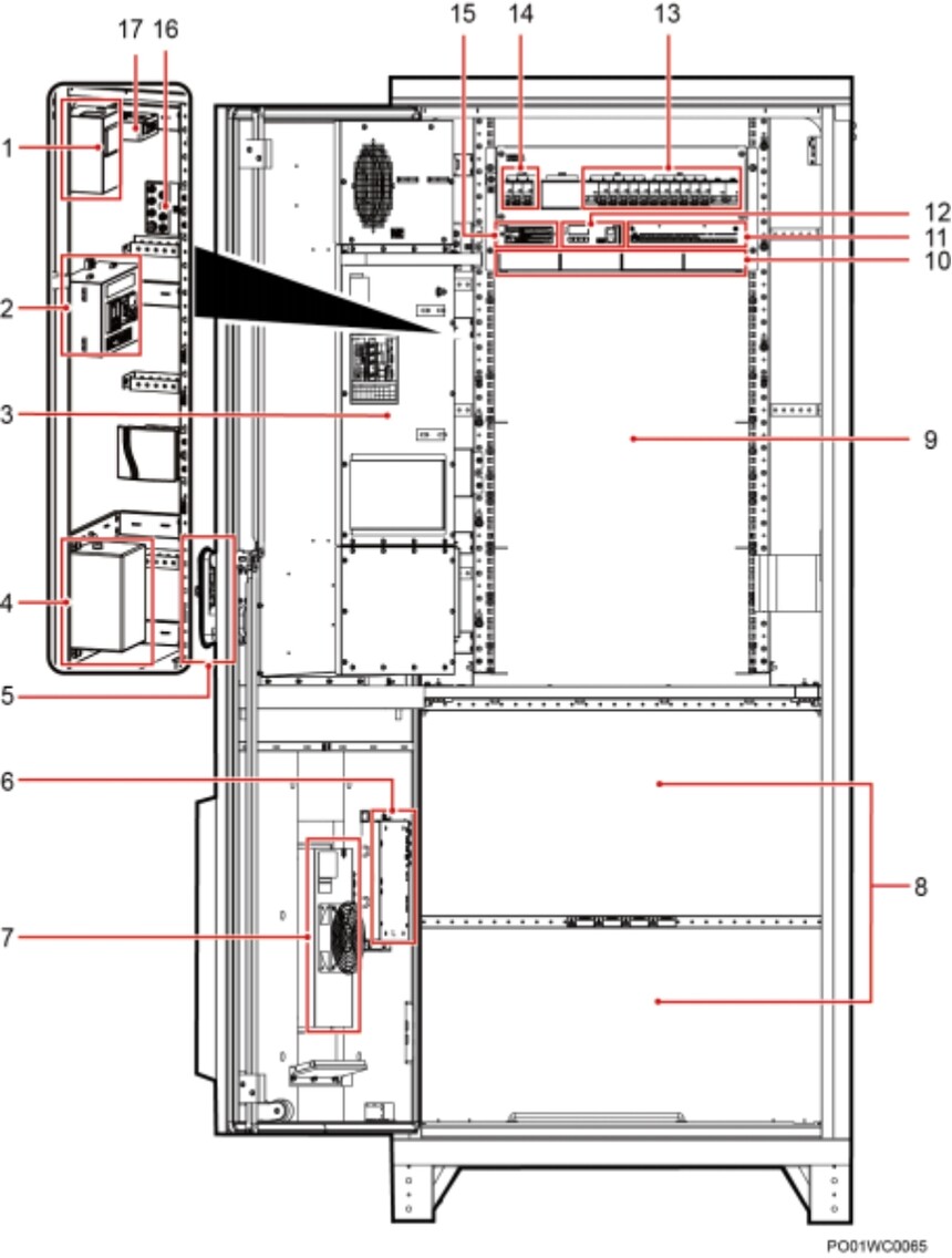 (1)智能电表(选配) (2)维护插座(选配) (3)HXC70S 热交换器 (4)蓝牙控制器(选配) (5)电子门锁(选配) (6)TCUA 控制盒 (7)TEC 模块 (8)电池安装空间 (9)用户设备安装空间 (10)整流模块安装空间 (11)用户接口模块 (12)监控模块 (13)直流配电单元 (14)交流输入空开 (15)电池强制上电开关