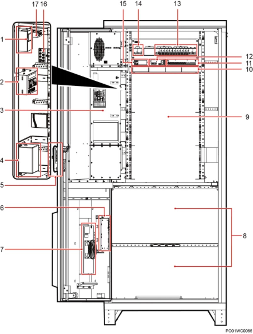 (1)智能电表(选配) (2)维护插座(选配) (3)HXC70S 热交换器 (4)蓝牙控制器(选配) (5)电子门锁(选配) (6)TCUA 控制盒 (7)TEC 模块 (8)电池安装空间 (9)用户设备安装空间 (10)整流模块安装空间 (11)用户接口模块 (12)监控模块 (13)直流配电单元 (14)交流输入空开 (15)电池强制上电开关