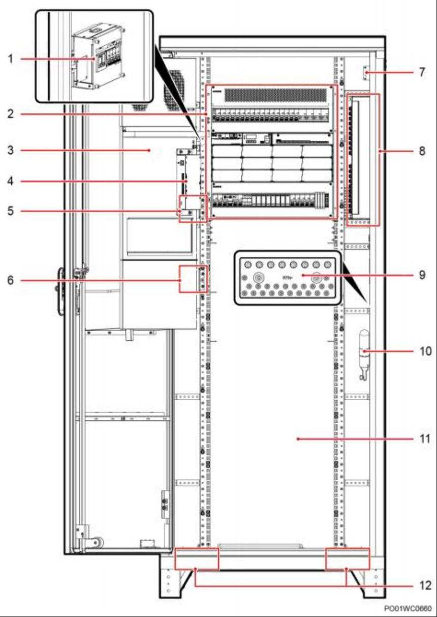 (1)交流输出盒 (2)电源插框 (3)热交换器 (4)TCUB 控制盒 (5)接地排 (6)温湿度传感器安装空间 (7)门磁传感器 (8)直流配电单元 (9)RTN+母排