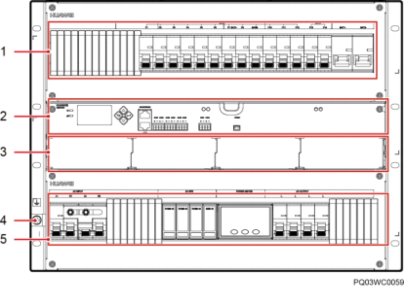 (1)直流配电单元 (2)SMU06C1 (3)整流模块安装空间 (4)接地螺丝 (5)交流配电单元