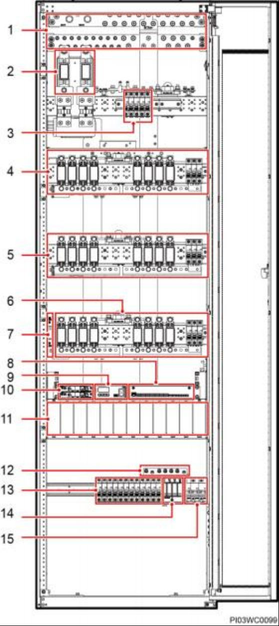 (1)RTN+母排 (2)电池熔丝 (3)用户 4 的负载空开 (4)用户 3 的负载熔丝和 (5)用户 2 的负载熔丝和 (6)用户 1 的负载熔丝和 空开 空开 空开 (7)公用直流防雷器 (8)用户接口模块 (9)监控单元 (10)通信扩展模块安装空 (11)整流模块安装空间 (12)N 接线排 间