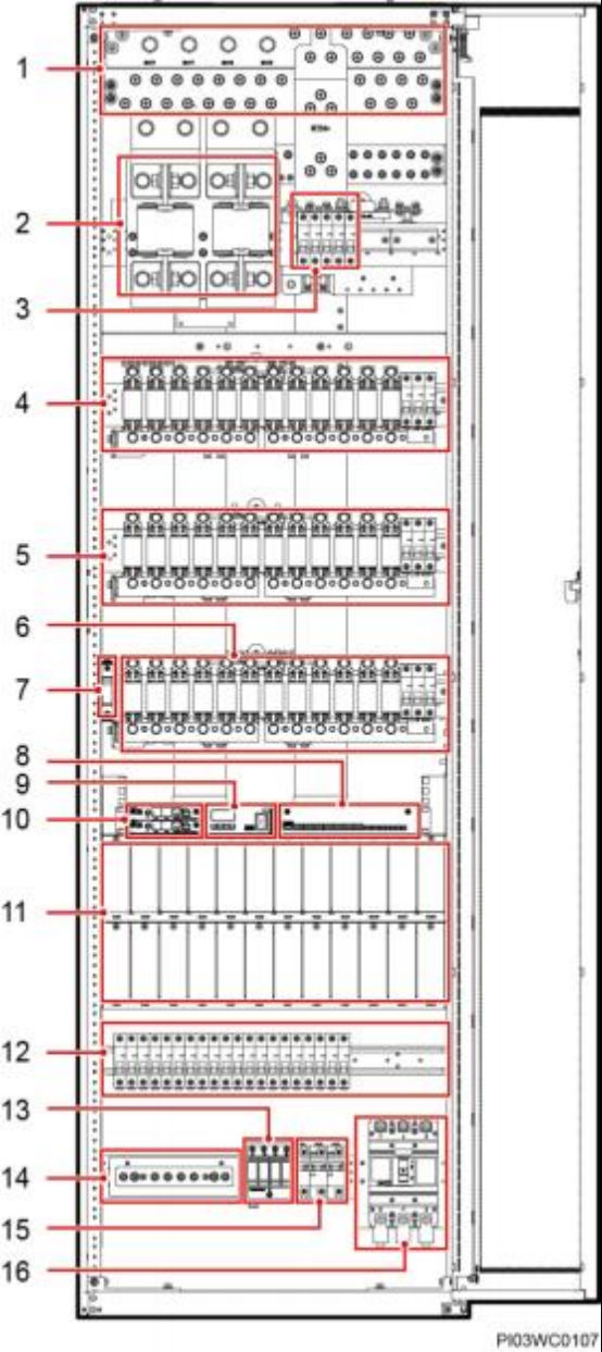 (1)RTN+母排 (2)电池熔丝 (3)用户 4 的负载空开 (4)用户 3 的负载熔丝和空开 (5)用户 2 的负载熔丝和 (6)用户 1 的负载熔丝 空开 和空开 (7)公用直流防雷器 (8)用户接口模块 (9)监控单元 (10)通信扩展模块安装空间 (11)整流模块安装空间 (12)整流模块空开 (13)交流防雷器 (14)N 接线排 (15)交流防雷器空开