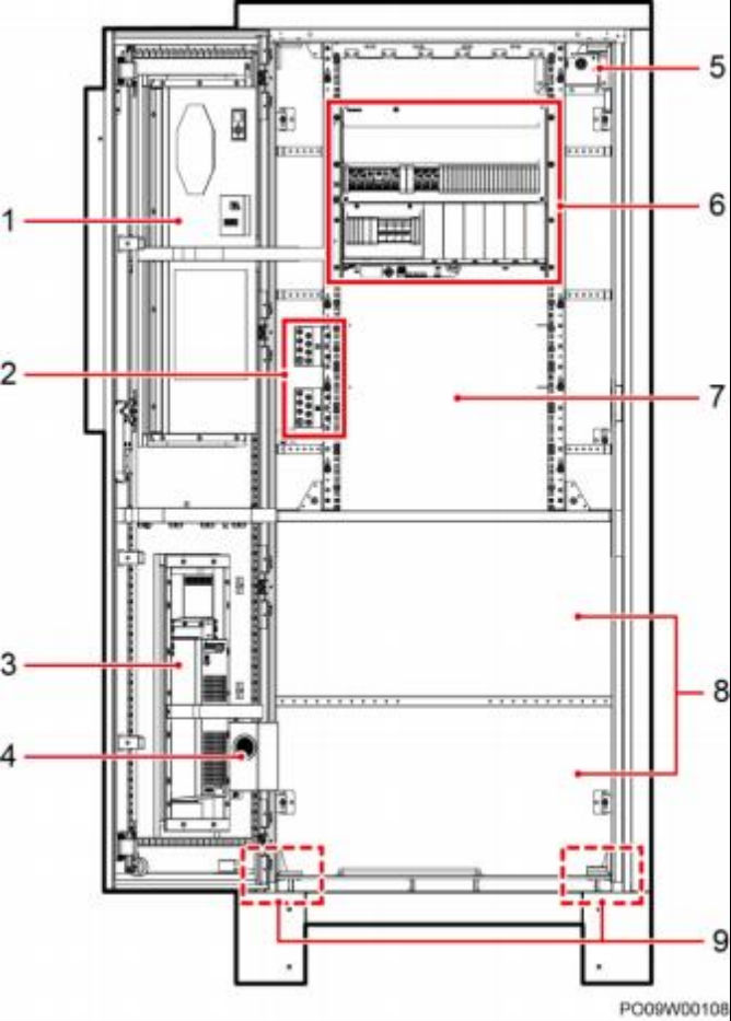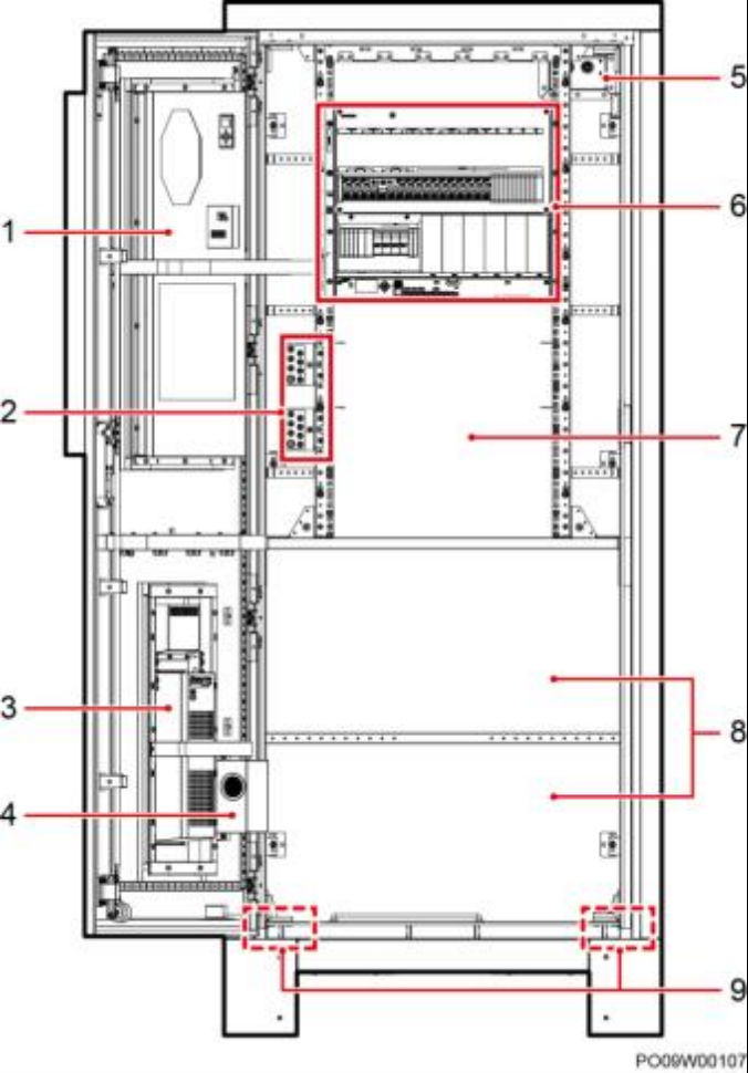 (1)PC1500H-1 (2)接地排 (3)PC300D (4)油机插座 (5)馈线窗 (6)电源插框 ETP48300-C9A2