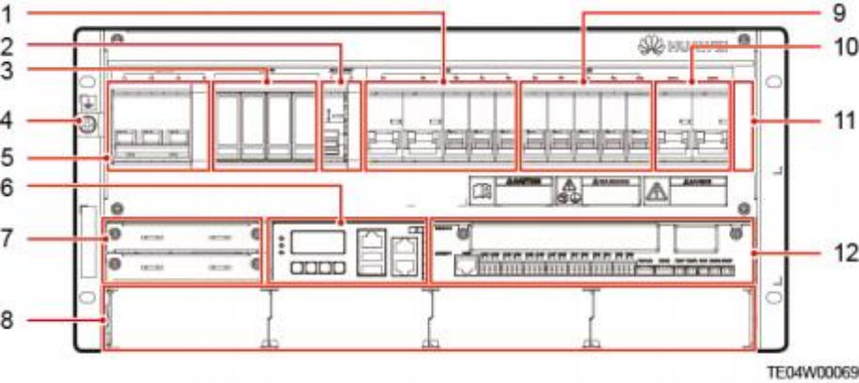 ( 1 )LLVD空开 (2)交流输出空开和端子 (3)交流防雷器 (4)接地螺丝 (5)交流输入空开和端子 (6)SMU02C ( 7 )通信扩展模块安装空间 (8)整流模块安装空间 (9)BLVD空开 ( 10)电池空开 ( 11 )调测开关(盖板后) ( 12)用户接口模块UIM02C C口 说明 插框出厂时,RTN+母排已与插框PE短接。 表 3-1 配电规格
