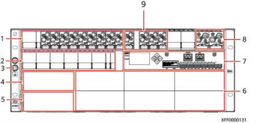 ( 1 )LLVD (2)直流输出支路(下层预 (3)接地螺丝 留) (4)整流模块/太阳能模块安装 (5)交流输入模块安装位置 (6)整流模块/太阳能模块安装 位置 位置 ( 7 )监控模块SMU06T2 (8)电池空开 (9)BLVD