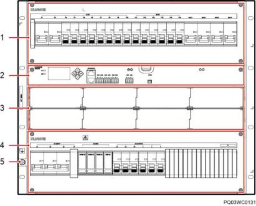 (1)直流配电单元 (2)SMU06C1 (3)整流模块安装空间 (4)交流配电单元 (5)接地螺丝