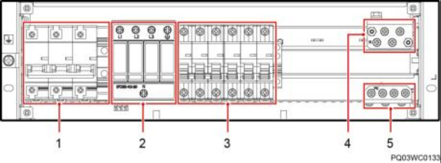 (1)交流输入空开及端子 (2)交流防雷器 (3)交流输出空开 (4)N 接线排 (5)PE 排