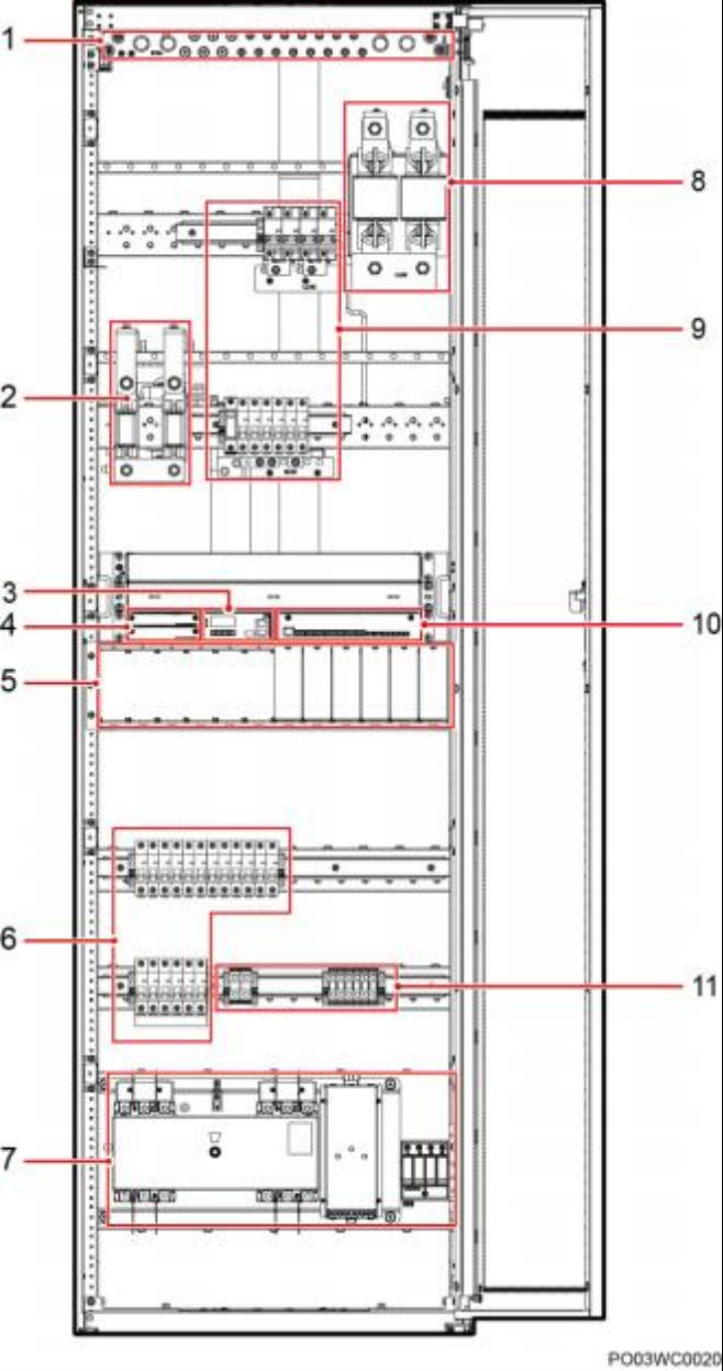 (7)交流切换开关 ATS (8)负载熔丝 (9)直流输出空开 (10)用户接口模块 (11)交流 N 端子 |