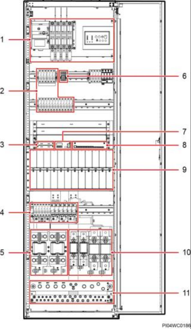 (1)交流切换开关 ATS (2)交流输出空开 (3)通信扩展模块安装空间 (4)直流输出空开 (5)电池熔丝 (6)交流输出 N 端子 (7)监控单元 (8)用户接口模块 (9)整流模块安装空间