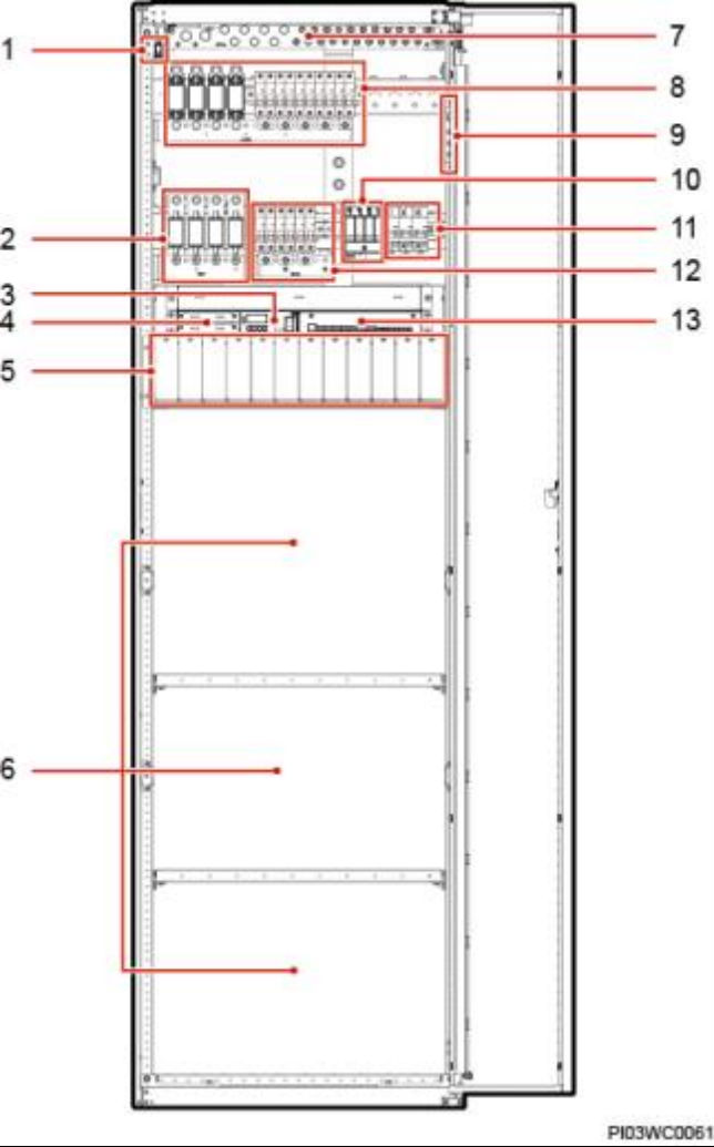 (4)通信扩展模块安装 (5)整流模块安装空间 (6)电池安装空间 空间 (7)RTN+母排 (8)次要负载空开和熔丝 (9)接地排 (LLVD) (10)交流防雷器 (11)交流输入空开及端子 (12)重要负载空开 (BLVD) (13)用户接口模块